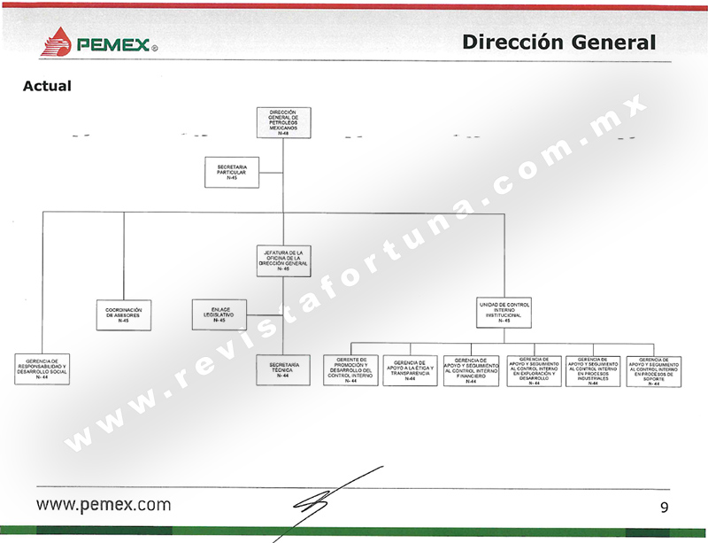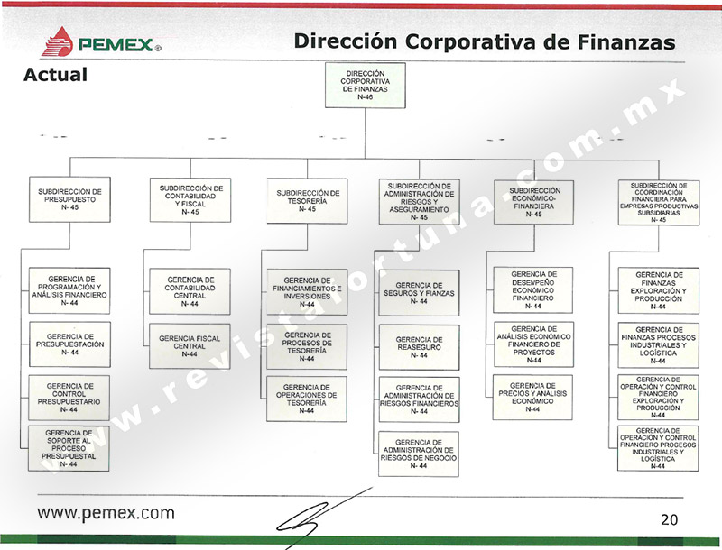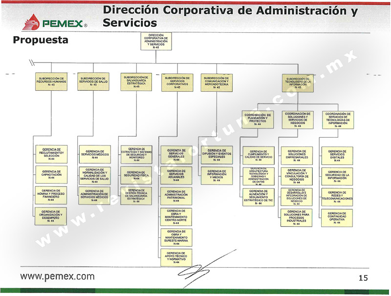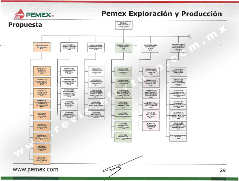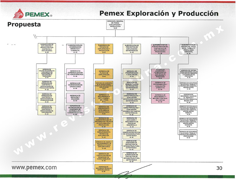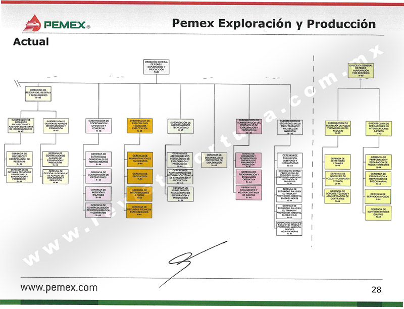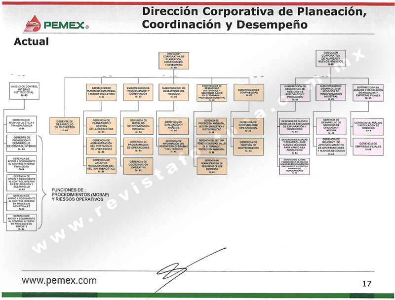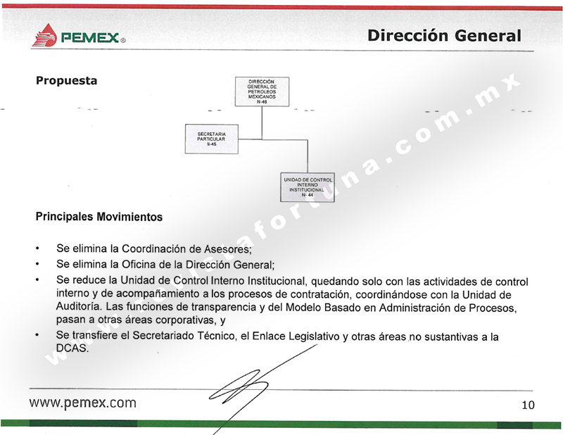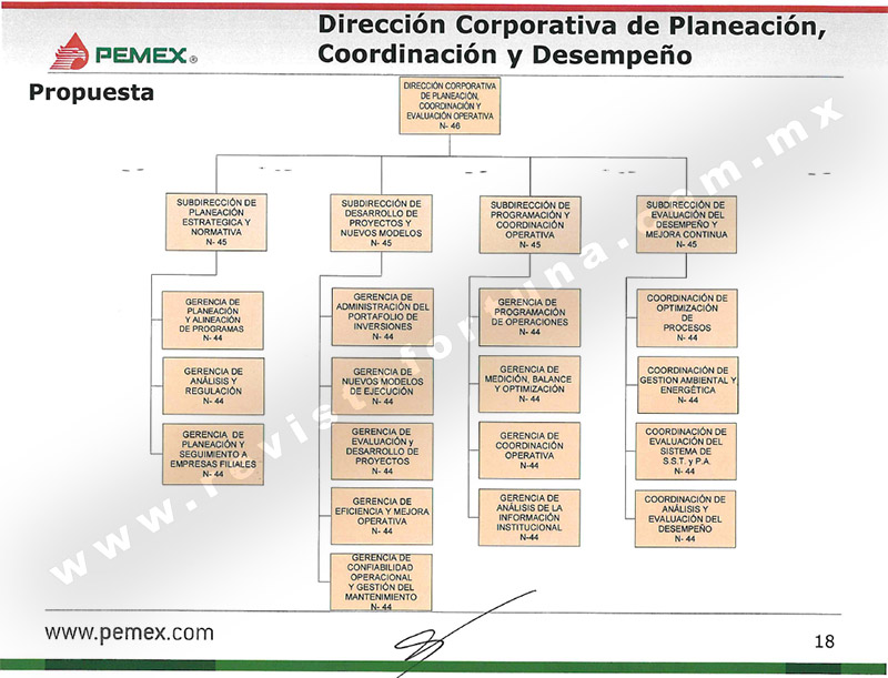 firmado por el director general de Pemex, Octavio Romero Oropeza y el Director Corporativo de Administración y Servicios, Marcos Manuel Herrería Alamina, destaca la desaparición de la Dirección Corporativa de Alianzas y Nuevos Negocios cuyo último director fue José Manuel Carrera Panizzo.