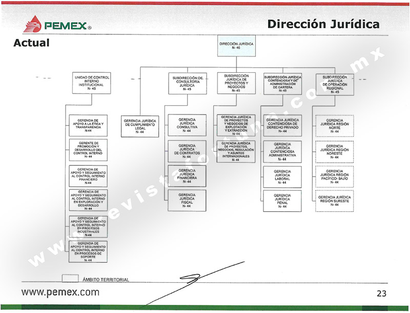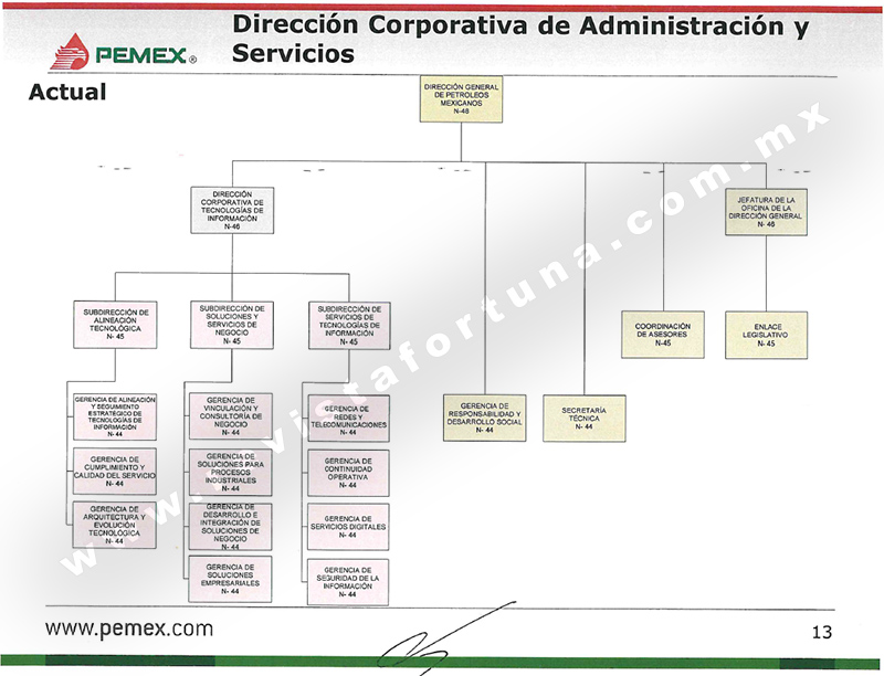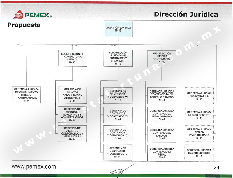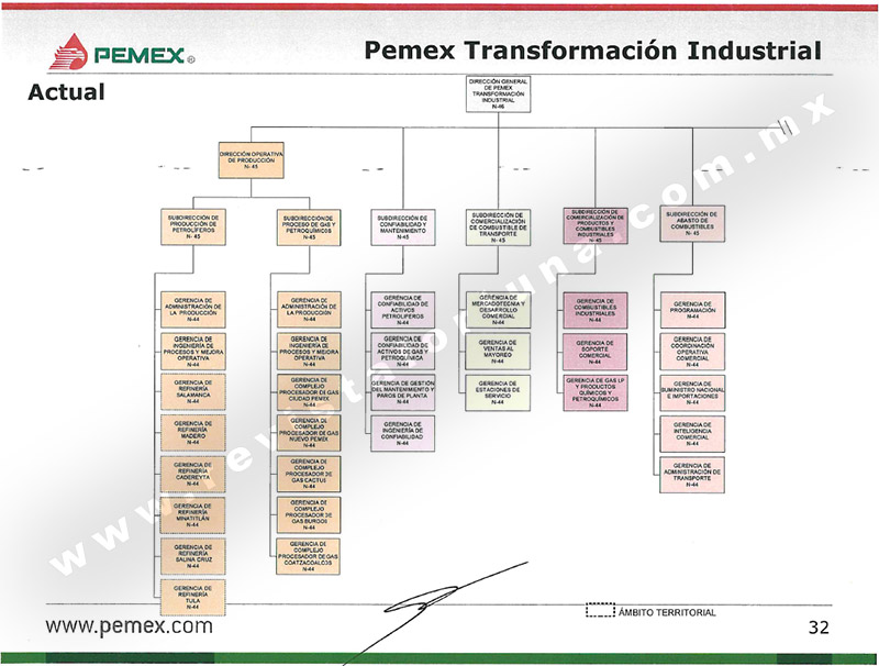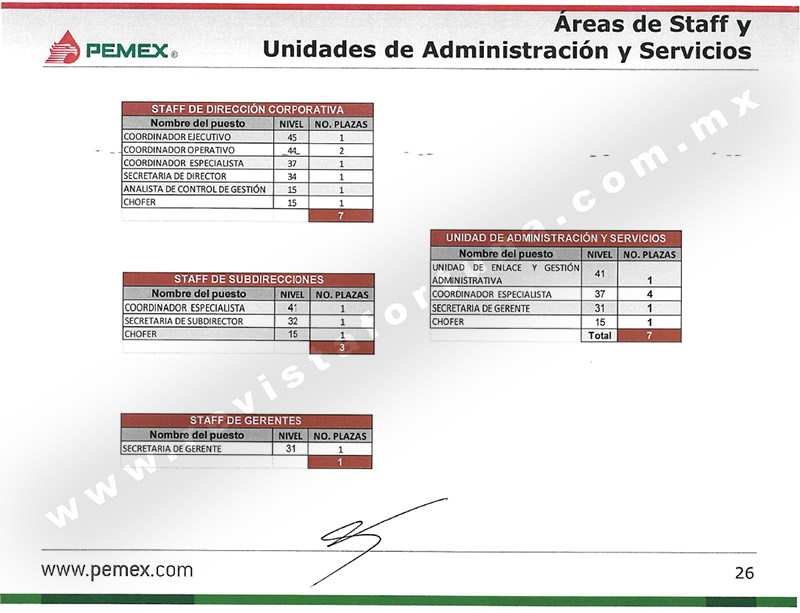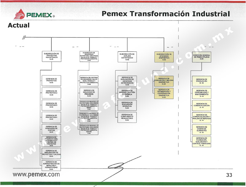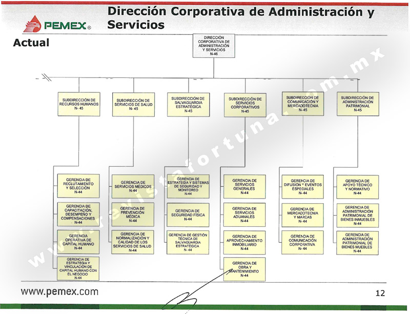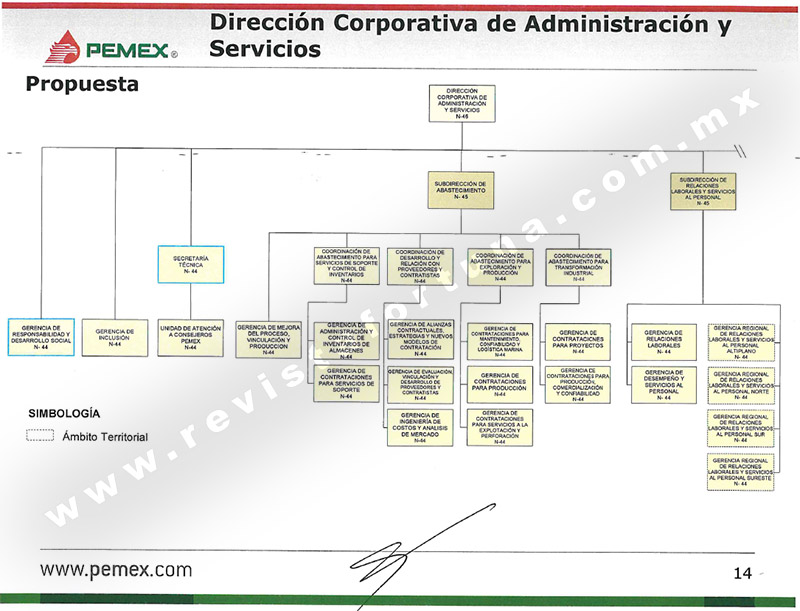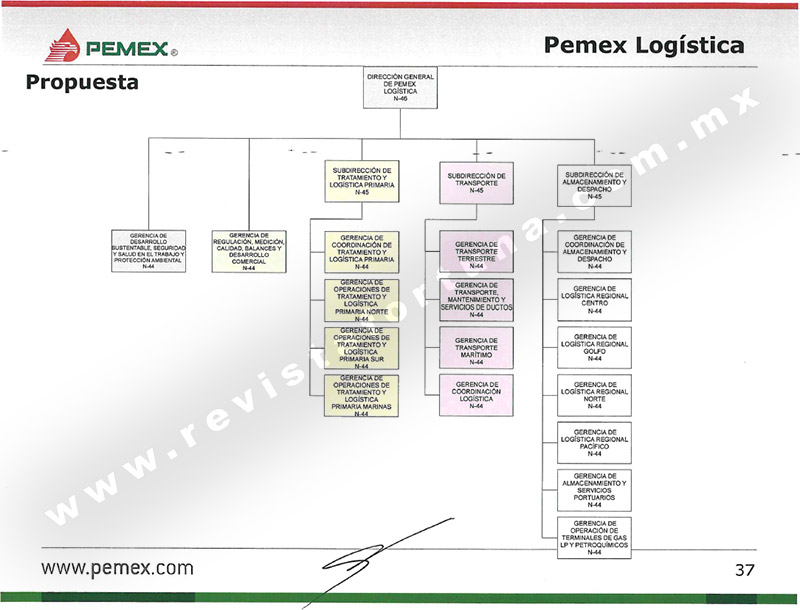 firmado por el director general de Pemex, Octavio Romero Oropeza y el Director Corporativo de Administración y Servicios, Marcos Manuel Herrería Alamina, destaca la desaparición de la Dirección Corporativa de Alianzas y Nuevos Negocios cuyo último director fue José Manuel Carrera Panizzo.