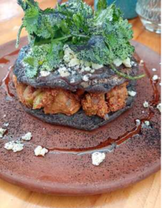 La propuesta gastronómica de Ajolote se basa en ingredientes locales: masa, frijoles, salsas y quelites frescos. Cada jueves, el chef va personalmente al mercado para surtirse de hongos, flores, hierbas, frutas y proteínas de productores cercanos. “Trabajo con gente como Felisa, que me vende hongos de Las Vigas. He ido a su casa, a sus fiestas. Ya no es solo una proveedora, somos parte de una comunidad. Eso me gusta mucho.”