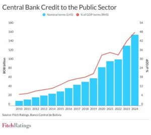 Fitch refirió que los déficits fiscales de dos dígitos de Bolivia, de un 11.2% sobre el PIB el año pasado, fueron impulsados “??en parte por cuantiosos subsidios gubernamentales”, que han sido financiados en gran medida por el banco central del país, mientras que el tipo de cambio paralelo “se ha debilitado notablemente con respecto al tipo de cambio fijo oficial”.