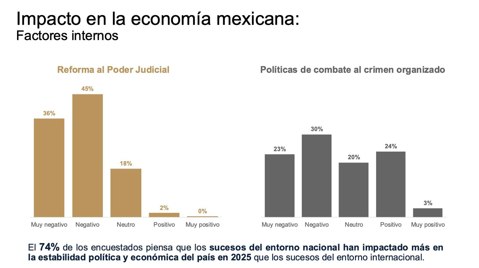 El estudio destacó la visión empresarial sobre la Reforma al Poder Judicial. En este punto el 81% de los empresarios la percibe negativamente; a su interior, el 36% dijo estar muy negativo, y el 45% negativo. Apenas el 2% lo ve positivo. El resultado propició que hoy este factor resalte como el de mayor riesgo de todo el estudio, inclusive superando la preocupación por la administración Trump o las políticas de combate al crimen organizado.
