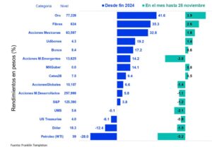 Datos de Franklin Templeton arrojan que desde finales de 2024 a noviembre pasado, los activos locales y el oro figuraron en la lista de preferidos para los inversionistas globales, donde los Fideicomisos de Infraestructura y Bienes Raíces (Fibras), una combinación de deuda y acciones, han dado rendimientos acumulados de 35.3%.