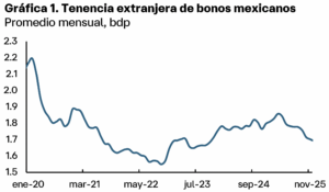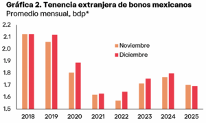 “De enero a noviembre, el monto promedio de bonos en manos de extranjeros se ubicó en 1.79 bdp (billones de pesos), ligeramente por encima del 1.78 bpd del mismo periodo de 2024”, sostuvo Díaz, que atribuyó la dinámica a los incrementos registrados especialmente en los primeros tres meses del año, “que compensaron el comportamiento descendente del resto de los trimestres”.