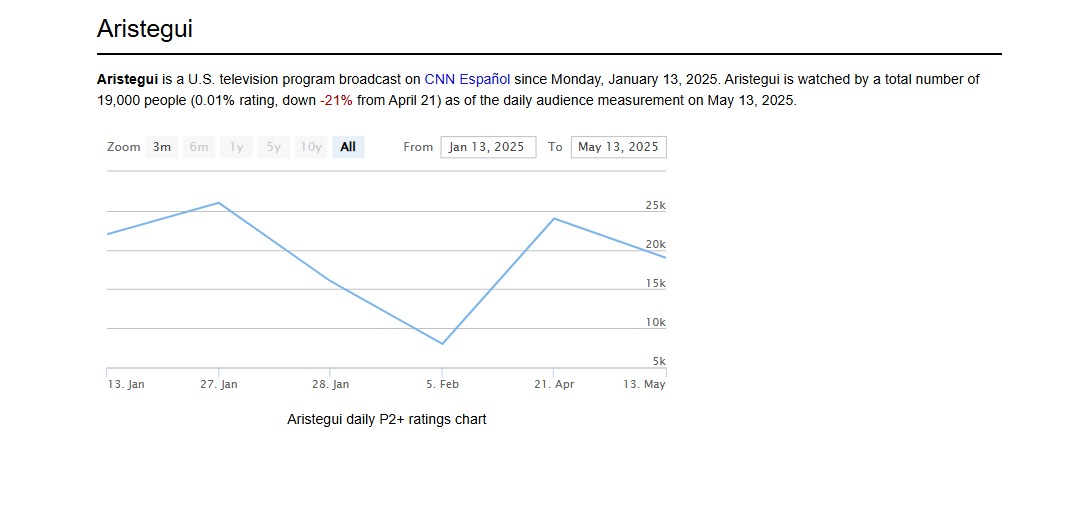 En efecto, detrás de la salida de Aristegui está, además, la caída en sus niveles de audiencia. Entre enero y mayo de 2025, el número de personas que observaron las emisiones del programa de Aristegui en CNN cayó más de 21% al pasar de 26,000 telespectadores a 19,000.