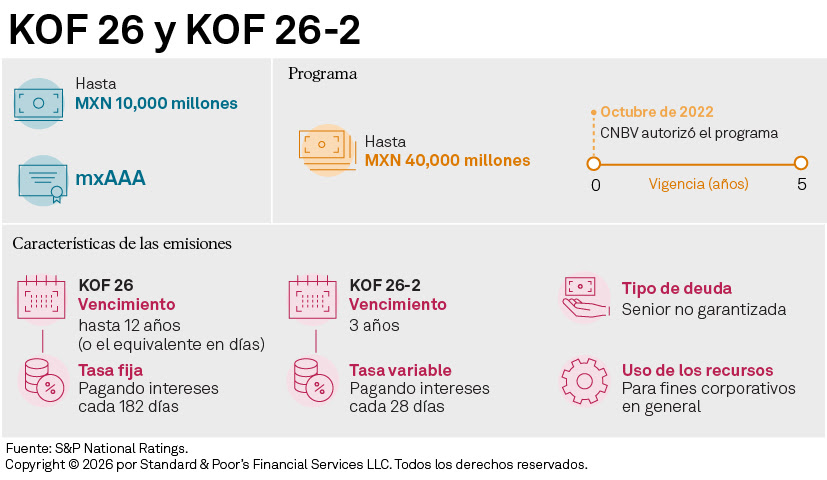 Información proporcionada por la calificadora internacional señaló que las colocaciones del mayor embotellador de Coca-Cola por volúmenes de venta a nivel global se harán bajo la modalidad de vasos comunicantes repartidos en dos emisiones, KOF 26 y KOF 26-2. El plazo de la primera emisión sería por hasta 12 años, o el equivalente en días, con una tasa cupón fija.