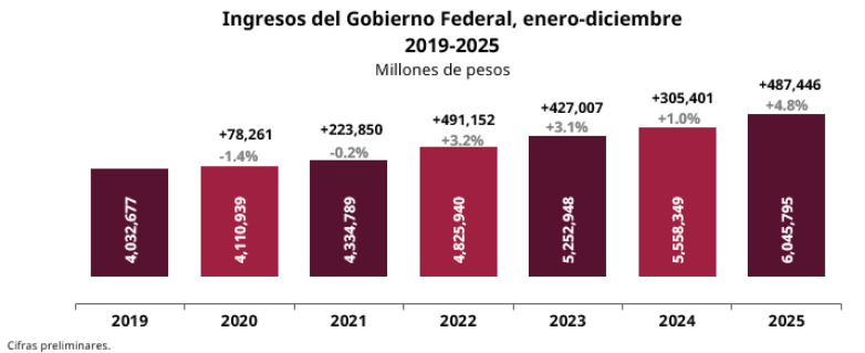 Los ingresos del Gobierno Federal alcanzaron en 2025 un total de 6 billones 45 mil 795 millones de pesos, la cifra más alta registrada hasta ahora, de acuerdo con datos del Servicio de Administración Tributaria (SAT). El monto representa un crecimiento real de 4.8 por ciento respecto a lo observado en 2024.