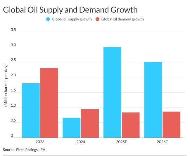 La agencia internacional de riesgos crediticios también prevé que la oferta de crudo al término del 2025 llegó a los 3 millones de barriles por día (MMbpd) mientras que en 2026 habría un aumento adicional de 2.5 MMbpd. Esto contrasta con la proyección de un crecimiento de la demanda global de apenas 0.8 MMbpd.
